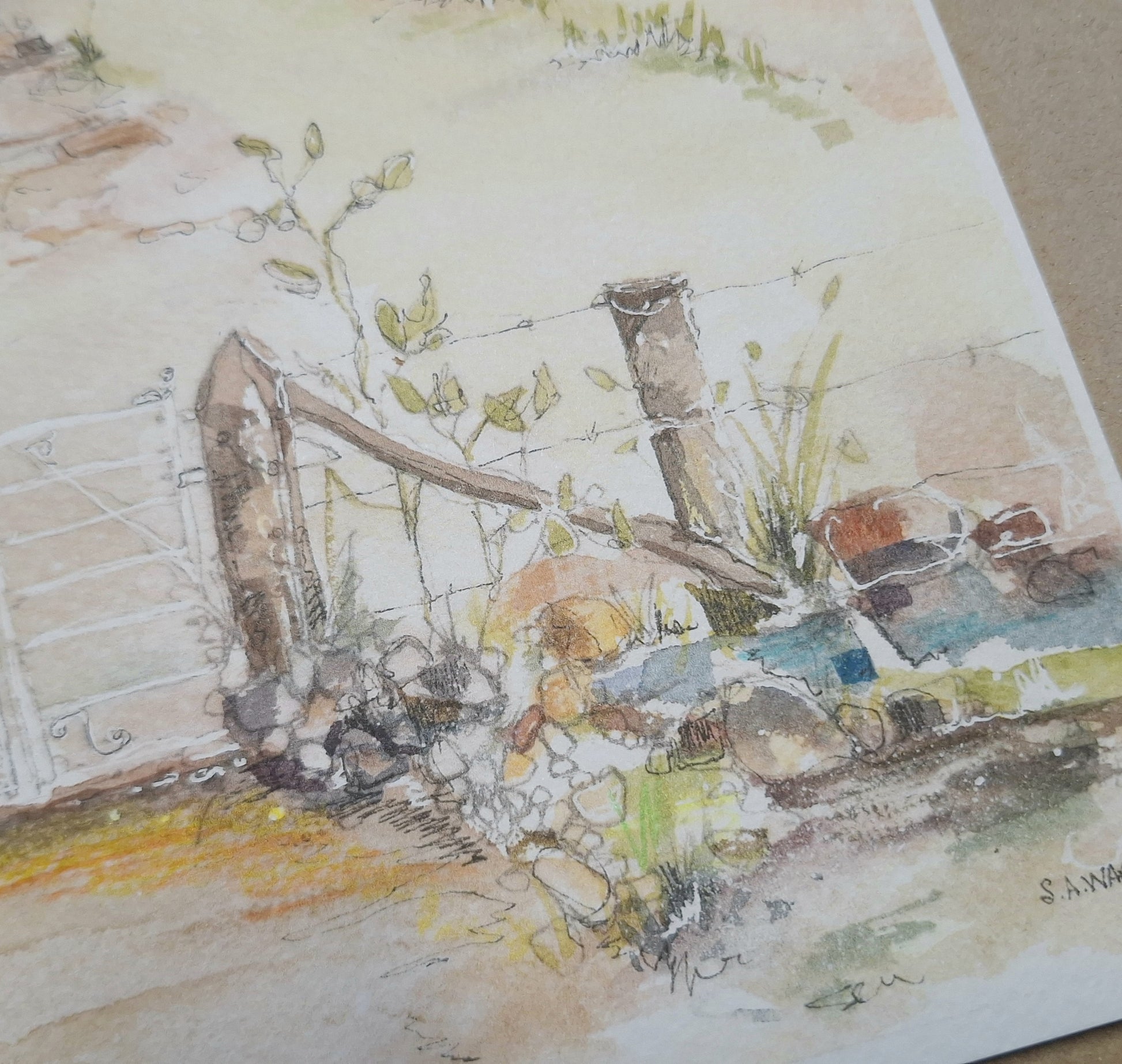 This print is from a pen and wash artwork that captures a quaint little cottage on a hill. The gate, fence and trees draw the eye to the happy location where washing hangs on the line outside.